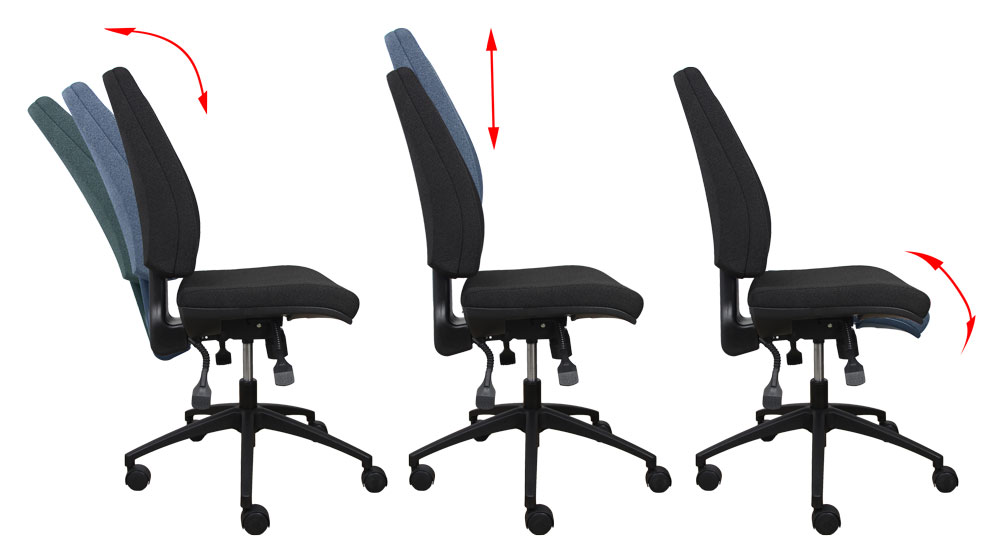 Ergonomic chairs have a synchronous (synchro) mechanism that allows you to change the angle of the backrest and seat. With a synchro mechanism, the movement of the backrest is always greater than the movement of the seat, typically in a 2:1 ratio i.e. the backrest moves 2 degrees for every 1 degree of movement in the seat.