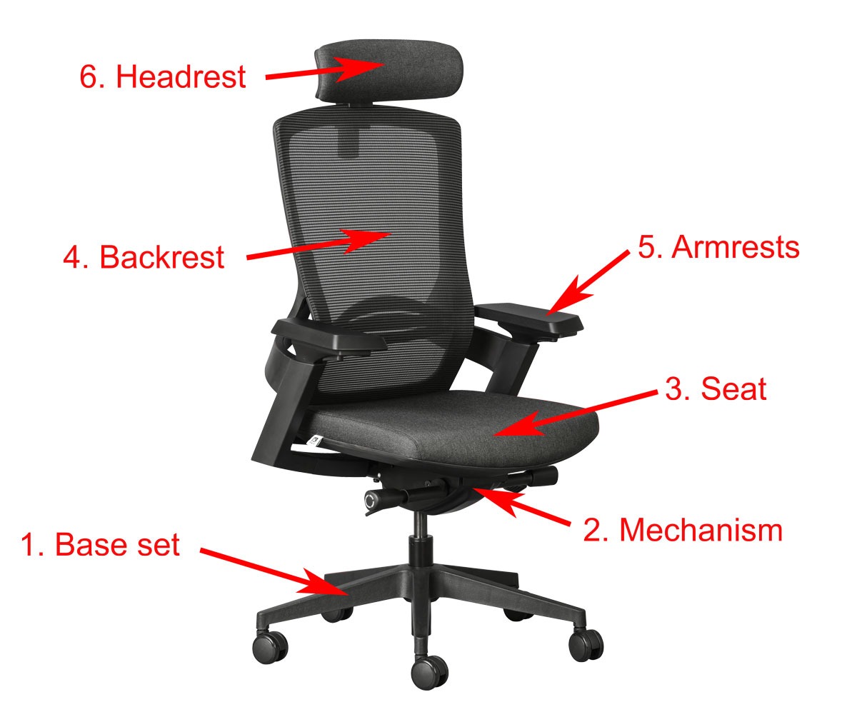 For a ‘heavy-duty’ chair, there are 5 components that must be strengthened to withstand the additional load. The 6th component (headrest), is optional.