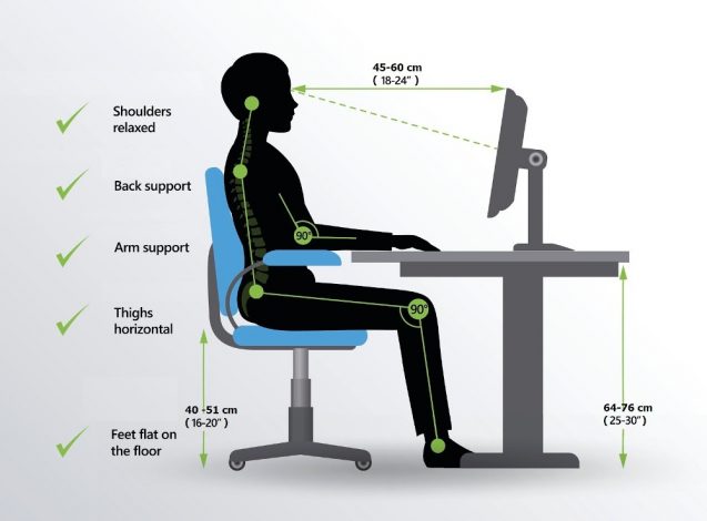 Ergonomic chairs should allow both “static” and “dynamic” sitting. The correct static seated position is shown below: