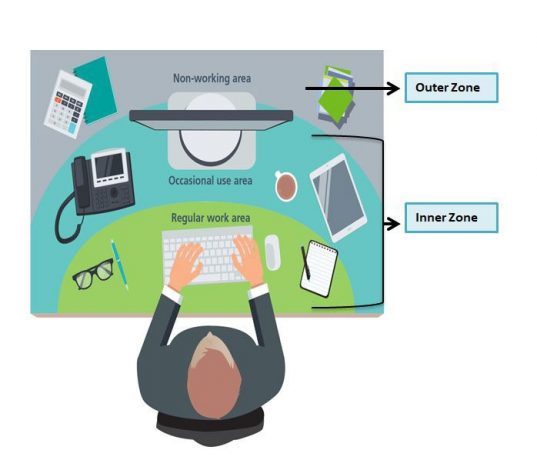Best ergonomic practices in the workplace: Avoid ergonomic hazards in the workplace like neck and shoulder pain by creating Inner and Outer zone working areas on your desk.